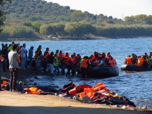 圖 : 難民到達希臘的萊斯沃斯島/相比旁邊燈塔的石灘,難民在這比較容易登岸