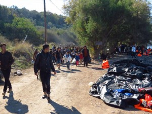 圖:難民登上萊斯沃斯島後,要步行至收容他們的營地,有的在60公里以外。
